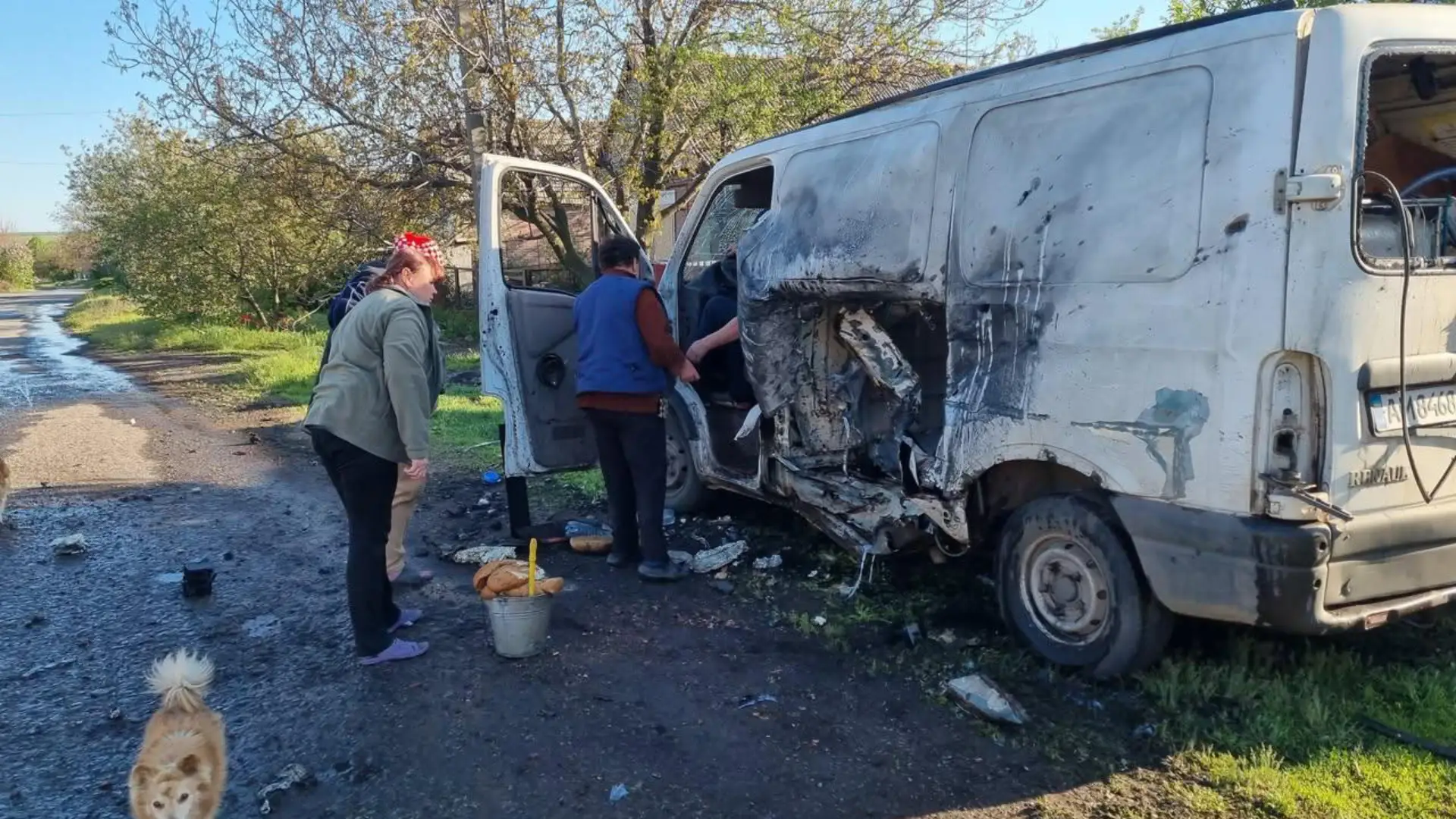 Recently, as he was driving through one frontline settlement, his van came under attack. Witnesses report that a Russian drone circled the vehicle before striking it several times. The blasts tore a hole in the side of the van, destroyed the container of drinking water, and left the vehicle badly damaged.